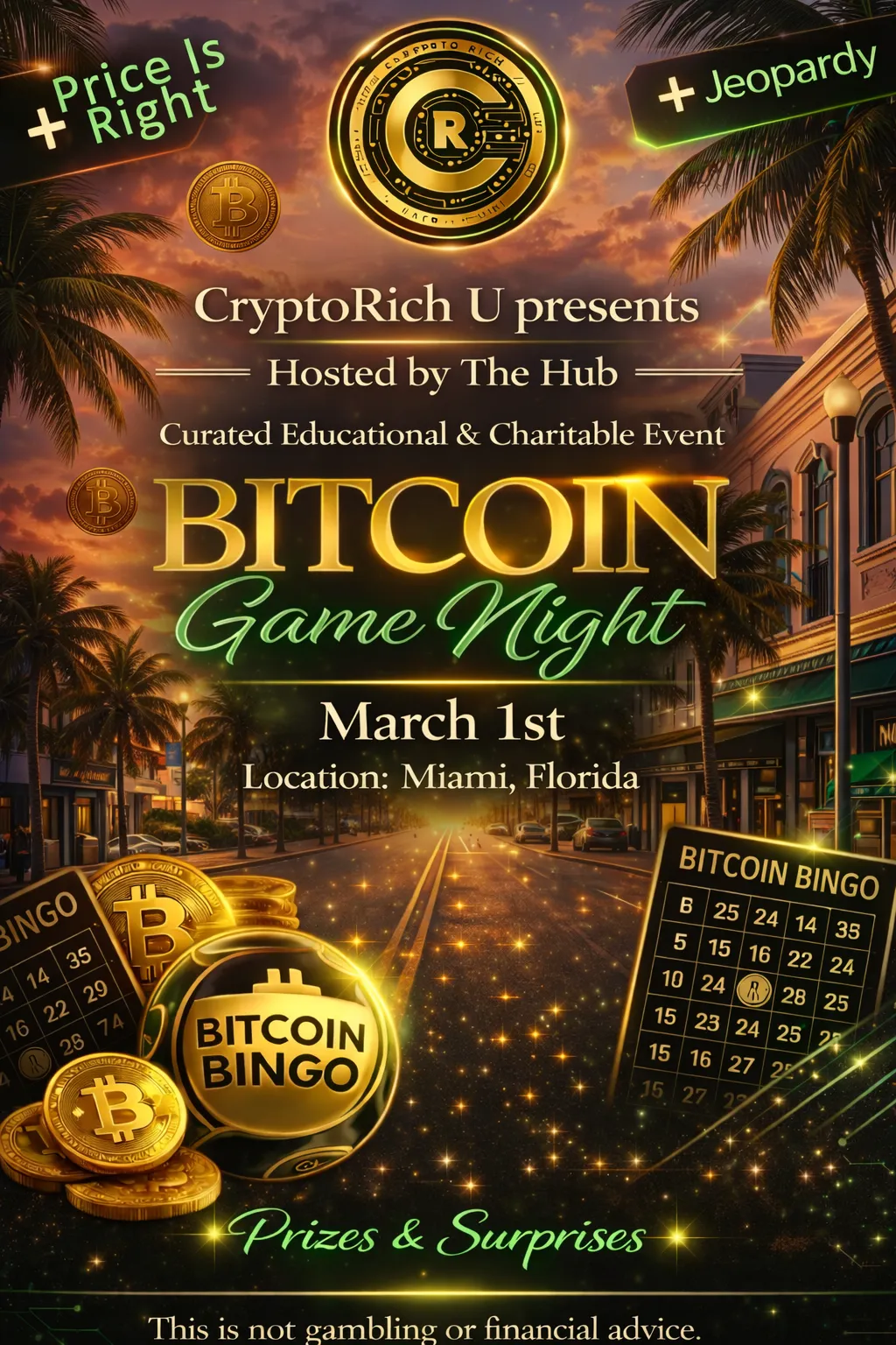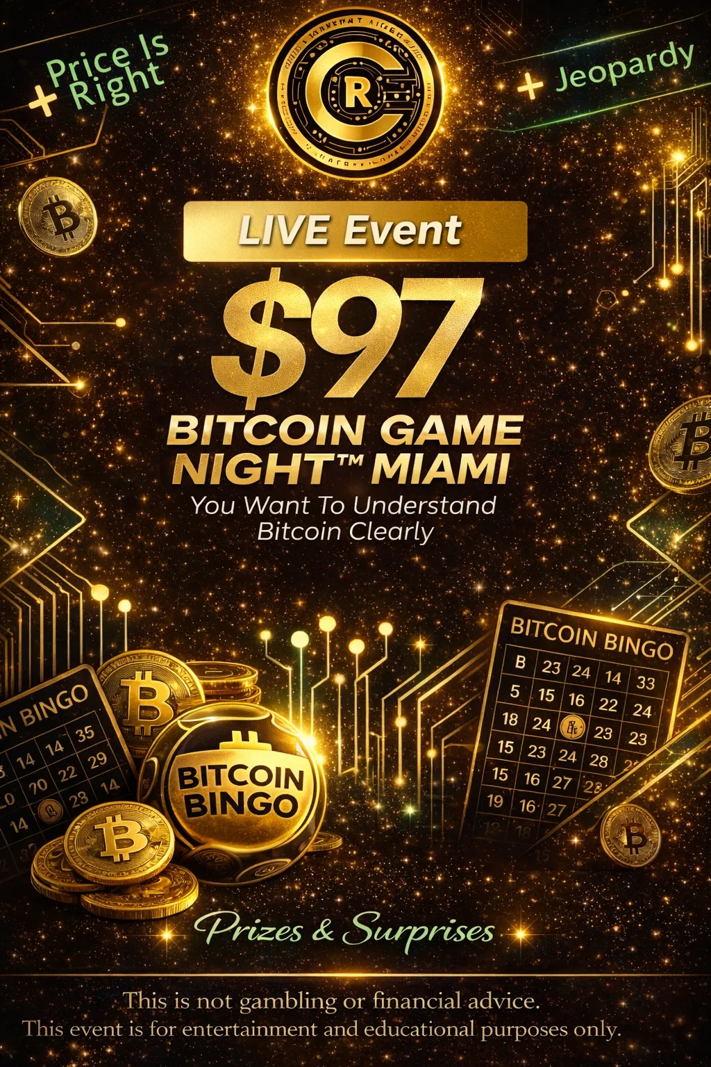 Bitcoin Game Night™ Official Terms & Conditions: Bitcoin Game Night™ is an educational promotional event designed to provide cryptocurrency and blockchain literacy in an engaging format, where games such as Bitcoin Bingo™, Crypto Jeopardy-style formats, Crypto Feud-style formats, and trivia-based challenges function strictly as instructional tools to reinforce learning and are not gambling, not a lottery, not a casino game, and not a sweepstakes requiring payment for a chance to win; participation fees (e.g., $100 or as listed) cover educational materials, live instruction, production, venue, and administrative expenses and may support disclosed charitable initiatives, and are not wagers, do not fund a prize pool, and do not increase the likelihood of receiving a prize; participants must be at least 18 years old (or 21 where required), comply with applicable laws, and not reside where such activities are prohibited, and the Organizer reserves the right to refuse participation for non-compliance; educational instruction is provided before and during gameplay with explanations of crypto terms, and materials may be distributed independently of gameplay without requiring additional purchase; winning patterns are announced before each round and the first verified participant to complete the pattern wins the designated promotional prize, with outcomes based on randomized term selection within an educational framework; prizes are promotional incentives only and may include Bitcoin, Bitcoin-equivalent value, sponsor-donated items, merchandise, or digital assets, determined by fair market value at time of award, not guaranteed, variable in frequency and value, with no substitution or cash equivalent unless stated, and the Organizer may substitute prizes of equal or greater value or modify the structure if necessary; any random Bitcoin micro-rewards for correct answers are discretionary promotional bonuses not guaranteed and not tied to entry fees; winners are solely responsible for applicable federal, state, and local taxes, and required tax forms (including IRS Form 1099) may be issued if thresholds are met; a portion of proceeds may support disclosed educational or charitable initiatives, and fees are not tax-deductible unless explicitly stated; all content is for educational purposes only and does not constitute financial, investment, legal, or tax advice, as digital assets are volatile and involve risk, blockchain transactions are irreversible, and the Organizer is not responsible for wallet mismanagement, incorrect addresses, or network delays; participants release and hold harmless Crypto Rich™, Michelle Lilly, event staff, sponsors, venue partners, and affiliates from claims related to participation, prize acceptance, digital asset transfers, or tax obligations; Bitcoin Game Night™, Bitcoin Bingo™, and related branding are proprietary intellectual property of the Organizer; the Organizer reserves the right to modify, reschedule, or cancel the event due to regulatory or operational necessity; disputes are governed by the laws of the State of Florida and resolved through good faith negotiation and binding arbitration where permitted; and by purchasing access or attending, participants acknowledge they have read and agree to these Terms & Conditions.